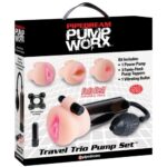 Desfrute do conforto de casa quando está em viagem com este Kit fantástico TRAVEL TRIO PUMP SET. Esta colecção de mangas portáteis e bomba, é uma combinação de masturbador e dispositivo ampliador do pénis. O luxuoso kit de 9 peças vem numa caixa de viagem com alça, e inclui uma bomba para iniciantes, 3 mangas em material Fanta-Flesh para cobrir a bomba, uma bala vibratória impermeável, um anel elástico para o pénis, amostras grátis do lubrificante Moist, um limpador de brinquedos Pump Worx e o creme para engrossar. As mangas Fanta-Flesh deslizam facilmente sobre a abertura da bomba e incluem um suporte para a bala vibratória. O material macio e flexível Fanta-Flesh envolve cada centímetro do seu pénis, apertando-o tão bem que vai parecer melhor que o real! E com cada aperto, o seu pénis fica maior, mais grosso, e inchado de potência, e o tubo transparente permite vê-lo a crescer. Para prolongar a ejaculação, pode usar o anel para o pénis até que esteja pronto. O aperto para aguentar a ejaculação ajuda a mantê-lo erecto e prolonga a diversão. Quando terminar, basta desconectar a mangueira de vácuo do cilindro, retire a manga da bomba, e deixe-a como nova lavando-a com água morna e um produto de limpeza para brinquedos da nossa seção de desinfectantes.